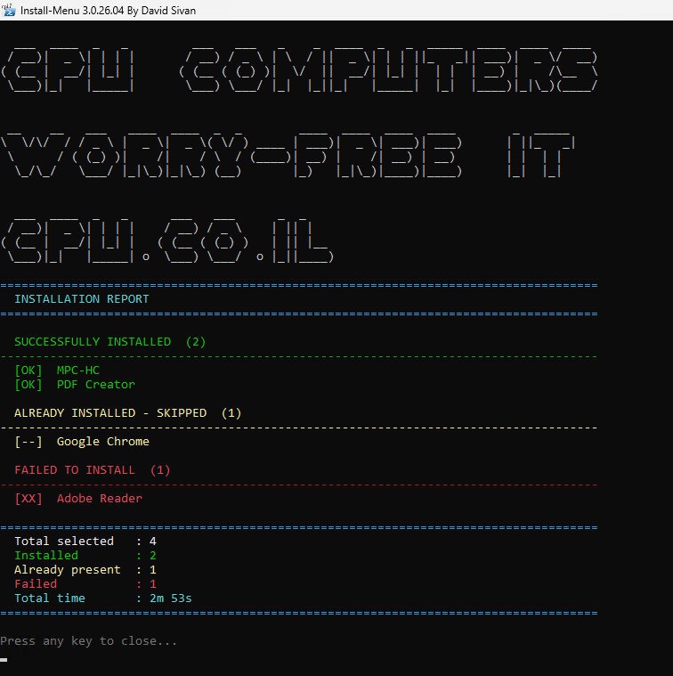 בגרסה 3 הוספנו גם דוח מרכז בסוף ההתקנות שמראה איזה מהתוכנות הותקנו בהצלחה, על איזה תוכנות דילגנו בהתקנה כי הן כבר מותקנות ואיזה תוכנות נכשלו בהתקנה, בנוסף הוספנו גם בדיקת קונפליקטים בין תוכנות, למשל אם תבחרו להתקין אופיס גם בגרסה 32 וגם בגרסת 64 תקבלו התראה לפני ההתקנה שזה מתנגש, כנ"ל באנטי וירוסים.